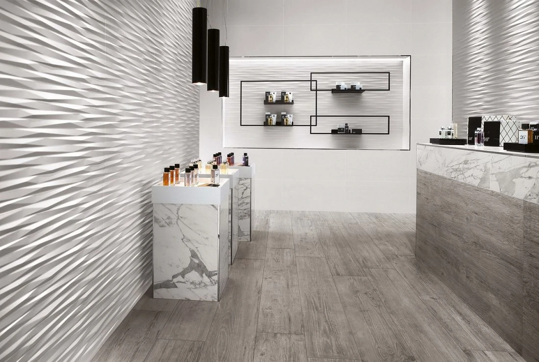 В последнее время в отделке помещений дизайнеры все чаще используют материалы с трехмерным изображением, которое как бы оживает на глазах и под разным углом освещения воспроизводит потрясающую игру света. Коллекция плитки Atlas Concorde 3D white является ярким примером отделки в трехмерном измерении. Она выполнена в духе современности, поэтому идеально подходит для оформления урбанистических интерьеров.