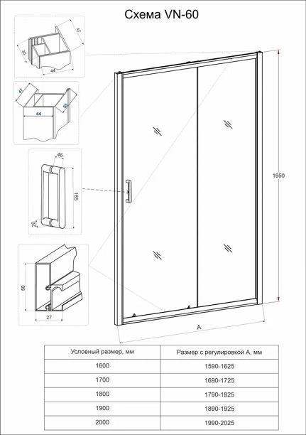 Душевая дверь Veconi Vianno VN-43. Душевая дверь распашная. Профиль анодированный алюминий с функцией подъёма 10 мм. Магнитный уплотнитель обеспечивает герметичное закрывание двери, плотно прилегая к профилю.Регулируемый профиль (возможность регулировки ограждения при неровных стенах и настроить размер ограждения под индивидуальный интерьер. Универсальная установка, левая-правая сторона. Позволяет устанавливать ограждение в зависимости от особенностей помещения. Толщина закаленного стекла 6 мм. Высота изделия 195 см.