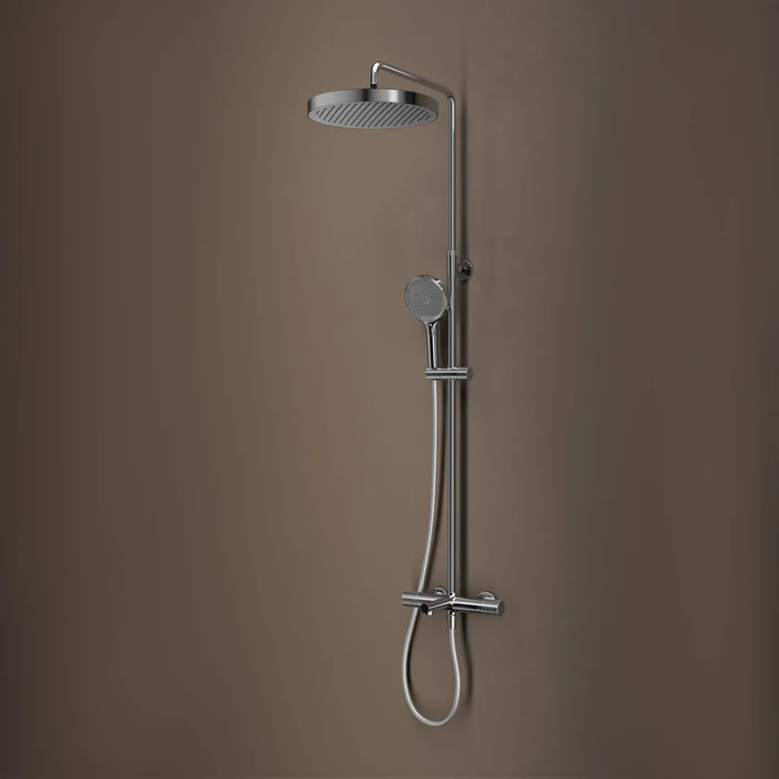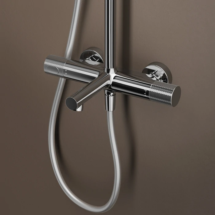 Душевая система с термостатом, тропическим и ручным душем и изливом Duna – воплощение актуальных трендов в дизайне смесителей в безупречном исполнении: фрезеровка, модные цвета и фактуры. Ручка выполнена из латуни для сохранения чёткости линий фрезеровки. Европейские комплектующие и технологии — для премиального качества. Без риска ожогов: термостатический картридж Sedal (Испания) обеспечивает стабильную температуру, комфорт и безопасность. Подключён напрямую к горячей воде — корпус не нагревается. Увеличенная кнопка безопасности для полной защиты от ожогов: интегрирована в ручку, не выбивается из дизайна и легко нажимается, фиксация на 38° защищает от случайного включения горячей воды. Обратный клапан предотвращает перетекание воды из труб в противоположных направлениях для поддержания стабильной температуры. Скрытый аэратор Neoperl (Испания) не нарушает дизайн, формирует ровный поток и снижает расход воды. Ключ для обслуживания в комплекте. Продуманная функциональность: внушительная верхняя лейка Ø32 см обеспечит всеобъемлющий поток, ручная лейка с 3 режимами, регулируемая до 140 см душевая стойка подходит для любого роста. Гибкий и надёжный силиконовый шланг 1,5 м. Повышенная стойкость к бытовой химии и механическим повреждениям благодаря надёжному PVD-покрытию. Или Хромированное покрытие устойчиво к потускнению (при должном уходе). Умные детали — для удобства каждый день: — Металлический держатель 360° регулируется по высоте и наклону, благодаря фрезерованной ручке фиксируется даже в мокрой руке. Пластиковая вставка предотвращает повреждение гайки шланга. — Комфортное чёткое переключение с щелчком при смене направления потока воды благодаря керамическому дивертору. Duna – там, где функциональность встречается с красотой.