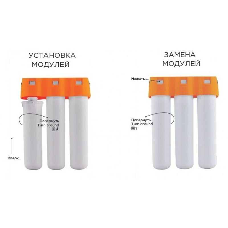 - Водоочиститель прост в эксплуатации. Замена модулей производится менее чем за 1 минуту без дополнительных инструментов.