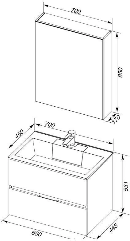 Мебельный гарнитур Акванет Алвита придаст интерьеру ванной комнаты нотку особого очарования и уникальности, благодаря своей нестандартной красивой отделке. Покрытие имеет высокие эксплуатационные характеристики, в частности влагонепроницаемость, прочность и простоту в уходе. Современный дизайн демонстрирует аккуратный минимализм геометрически четких форм, где основная идея подчинена максимальной функциональности. Вместительная тумба с верхним и нижним выдвижными ящиками и зеркало-шкафчик с полками за распашной дверцей создают дополнительное пространство, где будут надежно скрыты от влаги банные принадлежности, а все необходимое при умывании и принятии ванны теперь будет у вас под рукой. Ящики тумбы закрываются легко и бесшумно, благодаря механизму доводчика. Раковина «Фортуна» имеет уникальную конструкцию слива: вместо привычного расположения по центру, он находится в скрытом отсеке под съемной крышкой. Смещение слива и сифона к стене, в сторону канализационного отвода, избавляет от необходимости менять устройство верхнего ящика тумбы и делать в нем выемку. Теперь он свободно передвигается под раковиной и имеет большую вместимость. При желании гарнитур можно укомплектовать навесным пеналом в том же стиле, расширив зону хранения ванной комнаты.