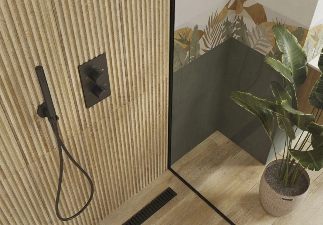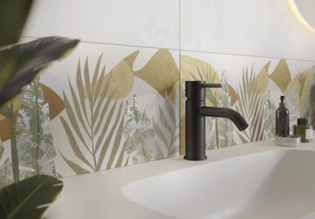 Коллекция керамической плитки New Garden формата 25х75 наполнена игрой. В её основе милый растительный декор, словно сошедший с ретро-открытки, но дизайнерский и модный. Фоном служат фигуры деликатных оттенков, в неправильных формах которых угадывается стиль мемфис. Игра продолжается в комбинации плоских и объёмных поверхностей, натуралистичной текстуры дерева и зелёного «крашенного бетона». Декорации с нежным мерцанием на вставке можно усилить золотистым металлическим бордюром шириной 0,5 см. Природную тематику поддерживают «керамогранитные доски» спокойного коричневого оттенка.