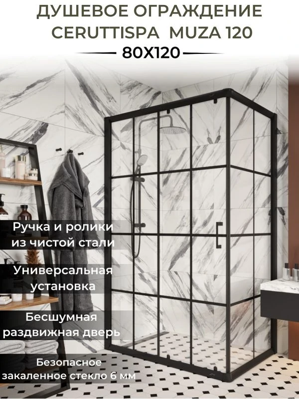 Душевой уголок Ceruttispa Muza120 без поддона Размер: 80х120х195 см Модель из прозрачного стекла с черным принтом лаконично впишется в современный дизайн ванной комнаты. Внутри уголок достаточно просторный. Достоинства: • Установка на подготовленный пол или поддон (приобретается дополнительно). • Закаленное стекло 6 мм практически невозможно разбить. В случае битья, полотно рассыпается на мелкие куски с тупыми концами. • Раздвижная дверь на двойных металлических роликах Doppi ходит плавно и бесмушно. Магнитный замок Soft close плотно смыкает створки и не позволяет воде просочиться наружу. • Ручка Acciaio puro из чистой стали не подвержена коррозии и не теряет эстетику на протяжении всего срока эксплуатации уголка. • Лево- и правосторонний монтаж. • Сборка Quick staple «на защелках» позволяет не использовать силикон. • Регулируемые пристенные профили обеспечивают плотное прилегание створок к неровным стенам. Приобретается отдельно: поддон QR 121 80x120x12, сифон