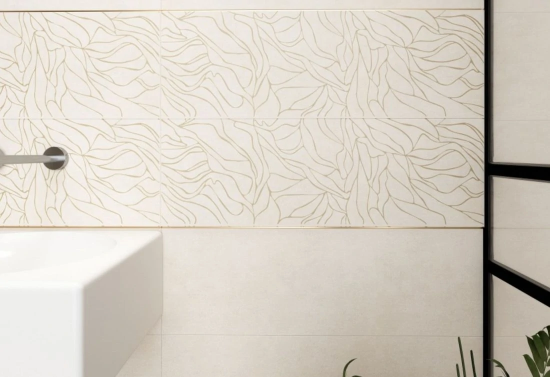 Гармоничное сочетание двух видов рельефных плит и двух видов декора открывает неограниченные возможности для творчества. Изящный цветочный орнамент играет на солнце янтарными отблесками, а золотые нити напоминают густое сплетение ветвей. Благородный блеск тончайшего золотистого бордюра, обрамляющего плиты, придает интерьеру завершенность. Тепло и уют интерьера подчеркнет керамогранит для пола с текстурой светлого дуба или песчаника.