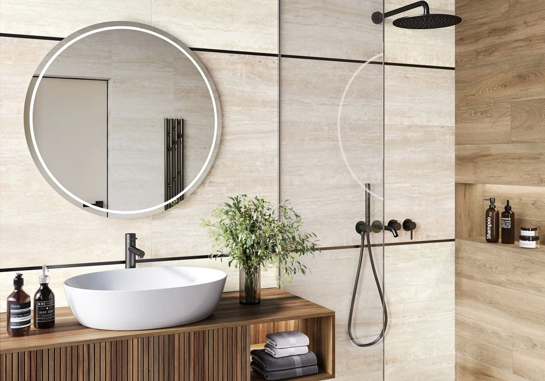 Модная коллекция под травертин в теплых оттенках. Травертин широко применяется в дизайне интерьеров благодаря своей природной красоте и универсальности. Такой вид мрамора прекрасно вписывается в различные стили, от классического до современного, и может стать ключевым элементом дизайна вашего пространства. Не ректифицированные края и матовая поверхность керамогранита подчеркивают натуральность и современность дизайна. Комбинация травертина коллекции Rim и текстурой дерева серии Goa создаст теплый и уютный интерьер с природной эстетикой. Такое сочетание идеально подходит для гостиных или загородных домов, добавляя интерьеру гармонии и тепла. Сочетание травертина и бетона из серии Flagman на разных стенах одного интерьера придаст интерьеру динамики и создаст современный интерьер с контрастом текстур. Это сочетание подойдет для офисов и городских квартир, добавляя интерьеру минимализма и стиля.