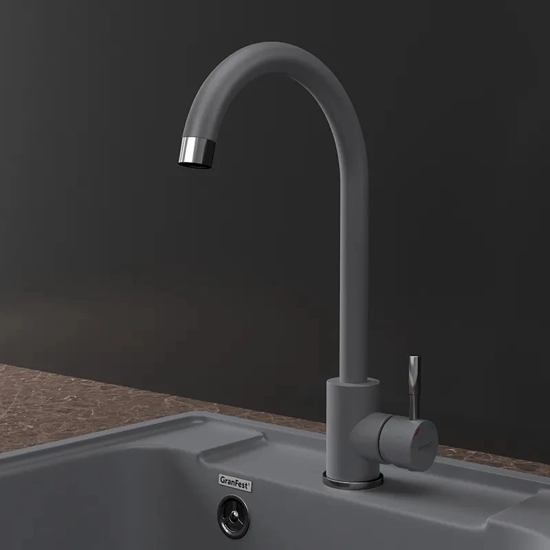 Поверхность смесителя окрашена в цвета кварцевых моек GranFest QUARZ.