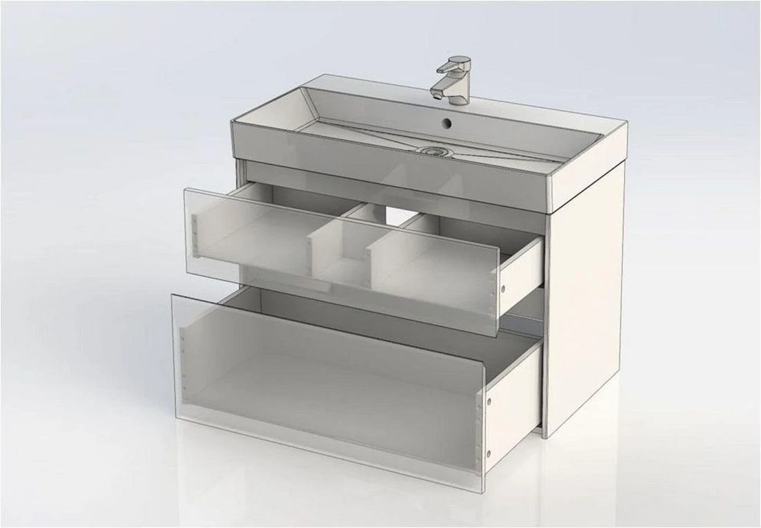 Тумба под раковину Aquanet Бруклин 85 белого цвета предназначена для подвесной установки. Изделие отвечает тенденциям минимализма. Аскетизм четких линий и обтекаемых форм в ней доведен до совершенства. В модели нет никаких выделяющихся деталей, и даже ручки интегрированные, когда открывание происходит за счет выступающей детали верхней или нижней части фасада, которая срезана под углом, в результате чего образуется выемка, служащая ручкой. В тумбе ручка устроена таким образом у верхнего ящика в нижней части фасада, а у нижнего – в верхней. Такое простое решение добавляет изысканности внешнему виду изделия. Раковина из керамики с тонкими изящными бортиками идет размер в размер с тумбой, ширина которой 85 см, в результате чего все изделие выглядит как единое целое. Корпус изделия выполнен из выкрашенного белой краской влагостойкого ЛДСП, фасады – из МДФ. На контрасте с белизной внешних деталей стильно смотрится корпус выдвижных ящиков, выполненный в цвете «дуб сонома». Нижний ящик тумбы имеет большую зону хранения, верхний разделен на несколько отделений, которые помогут грамотно разложить все необходимое по своим местам.