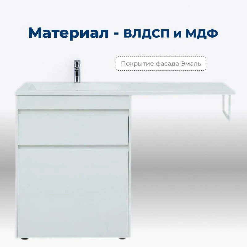 Тумба под раковину Aquanet Токио 130 белого цвета представляет новый формат тумб производства Aquanet. Раковина из литьевого мрамора имеет длинную платформу, которая выходит далеко за пределы тумбы. Она предназначена для того, чтобы установить с правой стороны от тумбы стиральную машину. Платформа имеет такую длину, которая позволит спрятать под нее машинку средних размеров с фронтальной загрузкой. Корпус тумбы выполнен из влагостойкого ЛДСП, а фасады – из МДФ с покрытием эмалью. Две зоны хранения в тумбе шириной 680 мм - это выдвижной ящик с доводчиками для хранения важных мелочей и откидная дверка с закрепленной на ней бельевой корзиной. Тумбу можно использовать и без соседства со стиральной машиной, а свободное пространство под платформой раковины занять подкатной тумбой, приспособлениями для уборки помещения или столиком.