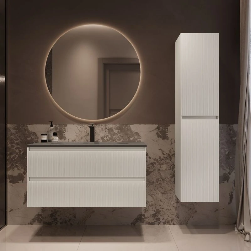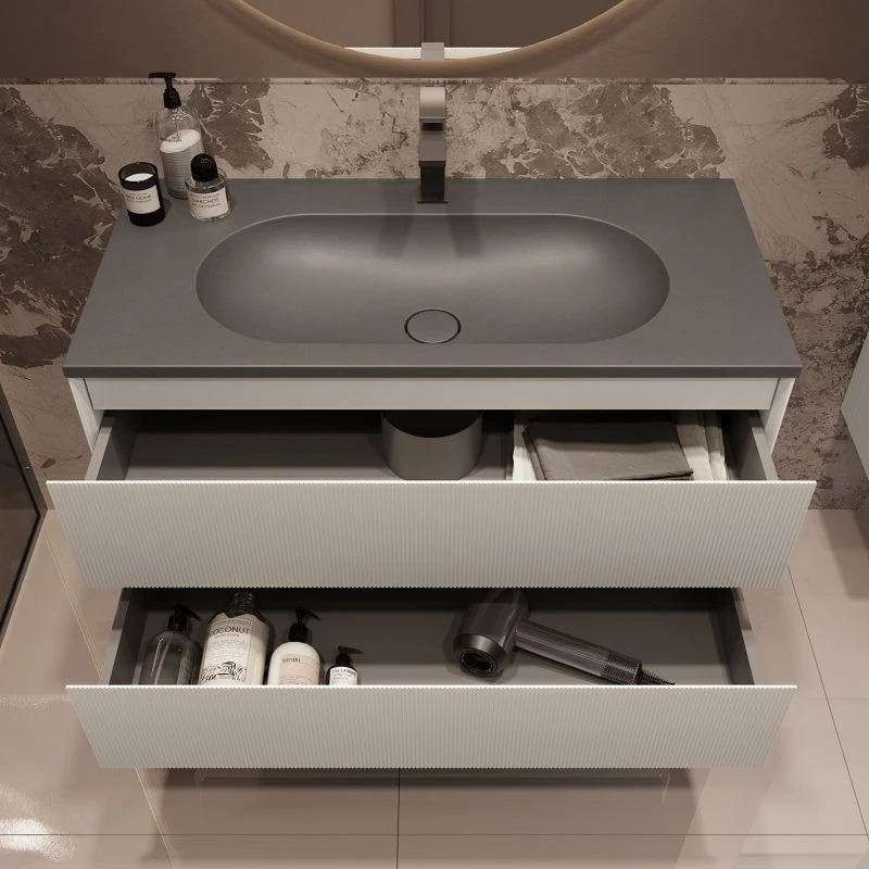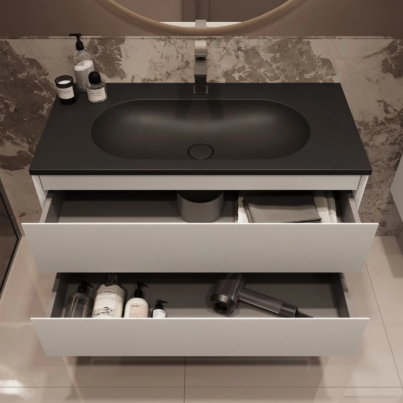 Мебель может быть укомплектована раковиной на выбор: белой, чёрной, серой, антрацит или цвета жасмин
