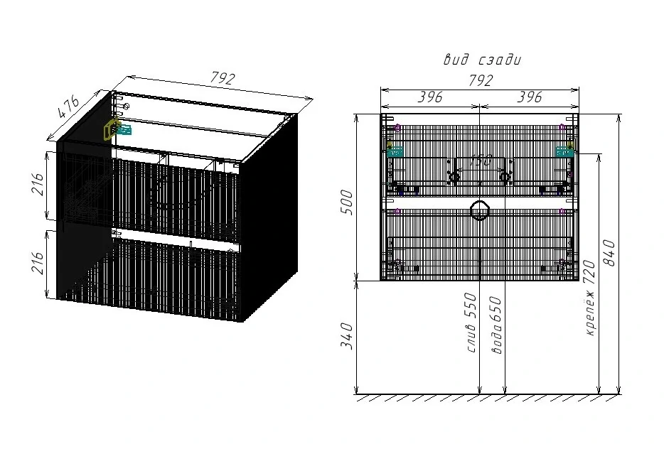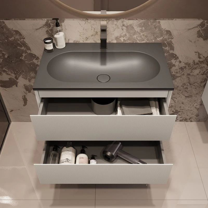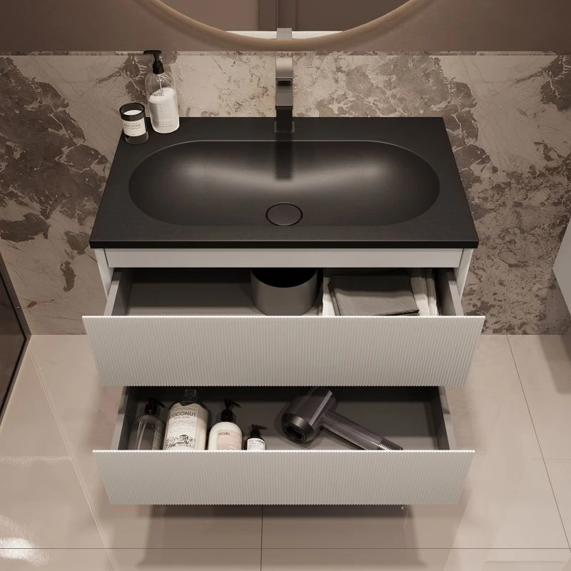 Мебель может быть укомплектована раковиной на выбор: белой, чёрной, серой, антрацит или цвета жасмин