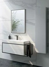 Подвесная тумба под раковину Aqwella Clarberg Logic 80 L LOG0108L с двумя ящиками и дополнительной консолью для полотенец справа. Главная особенность коллекции - это применение алюминиевого анодированного профиля в чёрном цвете.