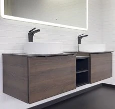 Модульная коллекция мебели для ванной. Устанавливая в стык две подвесных тумбы-умывальника Портленд 60 промежуточным звеном Портленд 30, получаем широкий комплект на две раковины Портленд 150