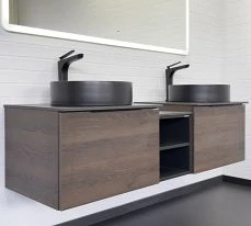 Модульная коллекция мебели для ванной. Устанавливая в стык две подвесных тумбы-умывальника Портленд 60 промежуточным звеном Портленд 30, получаем широкий комплект на две раковины Портленд 150