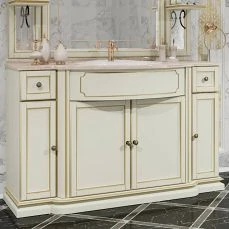 Opadiris Корсо-оро №11 станет настоящим украшением классического интерьера просторной ванной комнаты. Основа габаритного гарнитура шириной 140 см – напольная тумба с распашными шкафчиками и выдвижными ящиками, оснащенными механизмами плавного хода. Белоснежная фаянсовая раковина встраивается в эффектную мраморную столешницу. Завершает композицию большое зеркало с открытыми полками. Элементы коллекции объединены роскошными декоративными линиями. Верхняя часть имеет карниз с подсветкой, нижняя – мебельным плинтусом. Рамные фасады отделаны золотой патиной. На зеркале этот узор интерпретирован каймой-гравировкой. Фасадные части гарнитура выполнены из массива бука. Использование новейших технологий позволяет обеспечить надежную защиту древесины от воздействия влаги и перепадов температур.