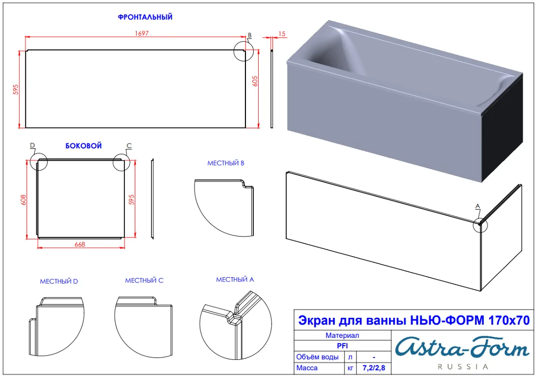 * Цвета окраски экрана к ванне: RAL , NCS (платная опция).
