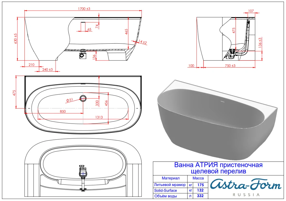 Доставка Ванна из литьевого мрамора Astra-Form Атрия 170х85 с щелевым переливом, донный клапан белый глянец