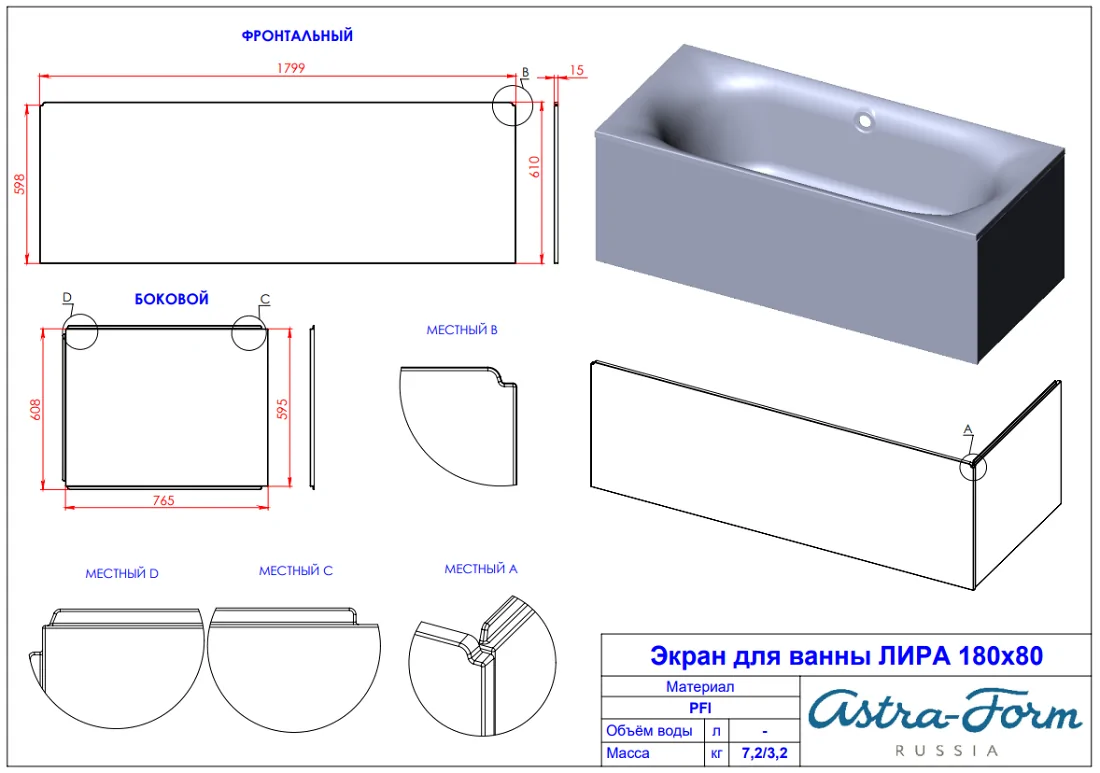 * Цвета окраски экрана к ванне: RAL , NCS (платная опция).