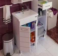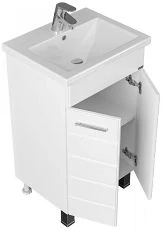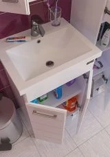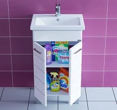 Тумба Оливия комплектуется зеркальным шкафом необычной формы, внутренне пространство которого поделено на ассиметричные секции, позволяющие разместить косметические предметы различной высоты и объема. Фасад оснащен петлями с доводчиком для комфортного использования. Зеркальный шкаф комплектуется регулируемыми навесами.
