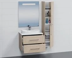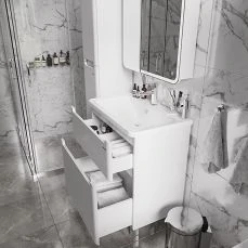 Зеркальная дверь с LED подсветкой и сенсорным выключателем создаст уют и дополнительное освещение, а пространство за распашной правой зеркальной дверцей, оснащенной механизмом плавного закрывания, станет удобным местом для хранения принадлежностей.