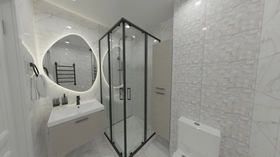 Асимметричное треугольное зеркало для ванной комнаты закругленными углами с проводом длиной 1,3 м и вилкой подключения в сеть 220 В.