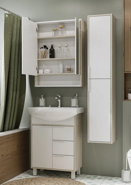 - Шкаф оснащен одной дверцей с двойным зеркалом на петлях с доводчиками для плавного и бесшумного открытия и закрытия.