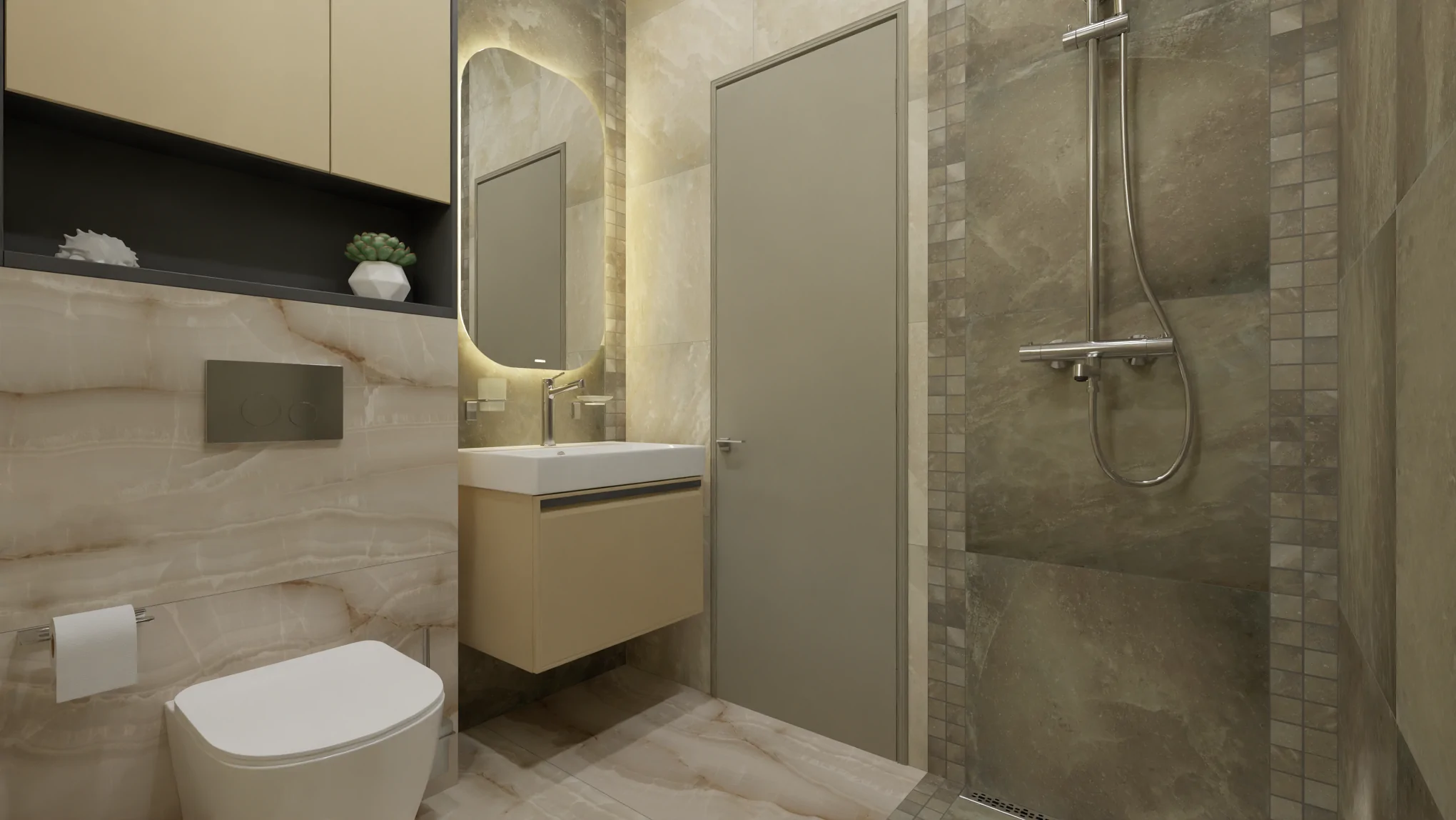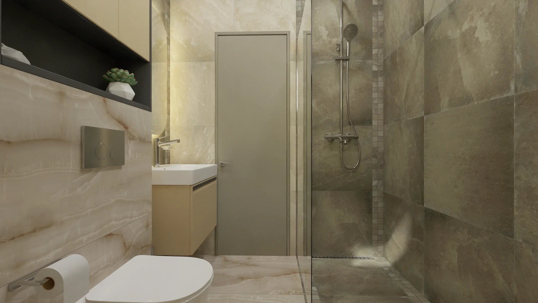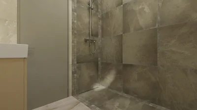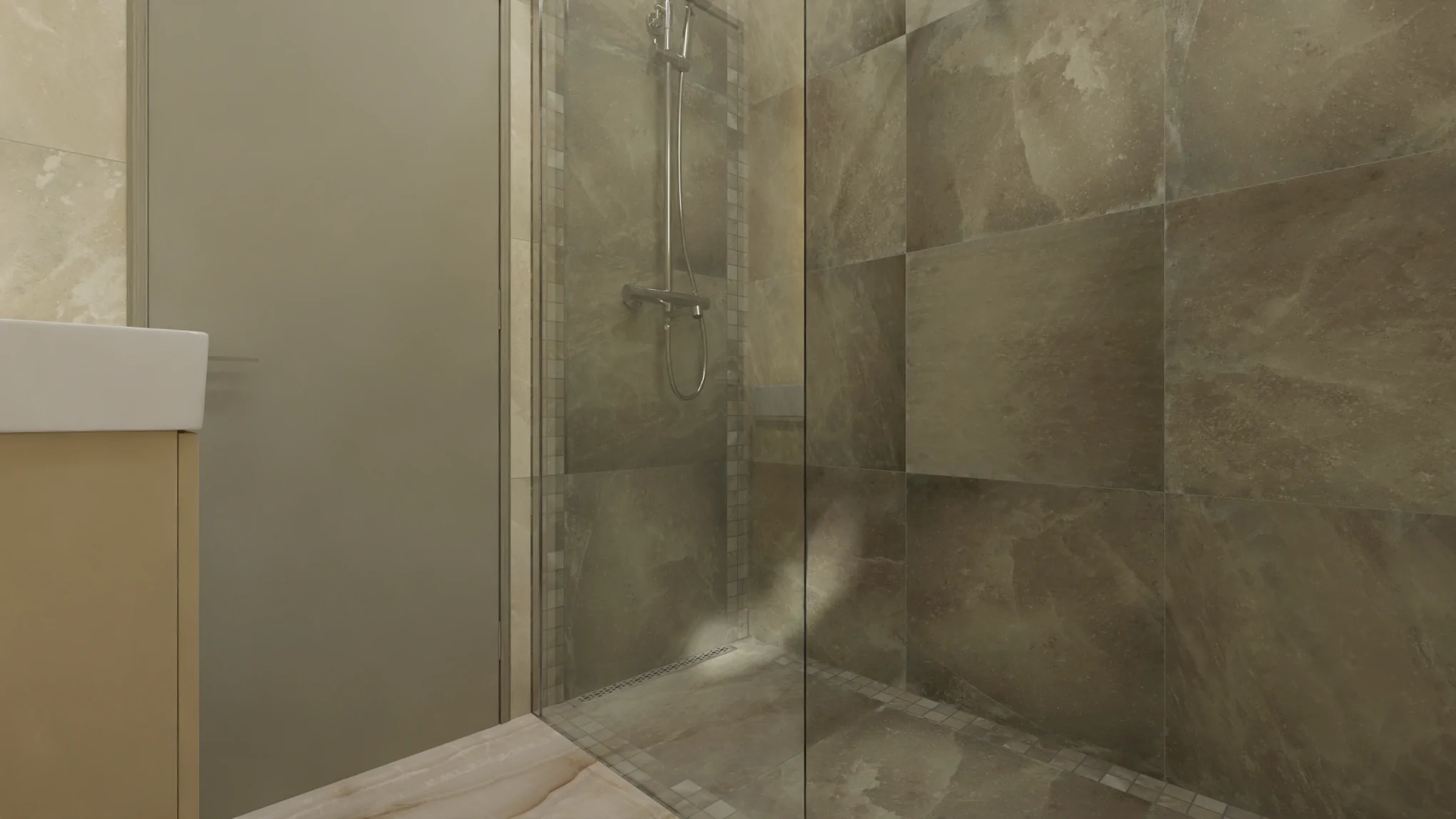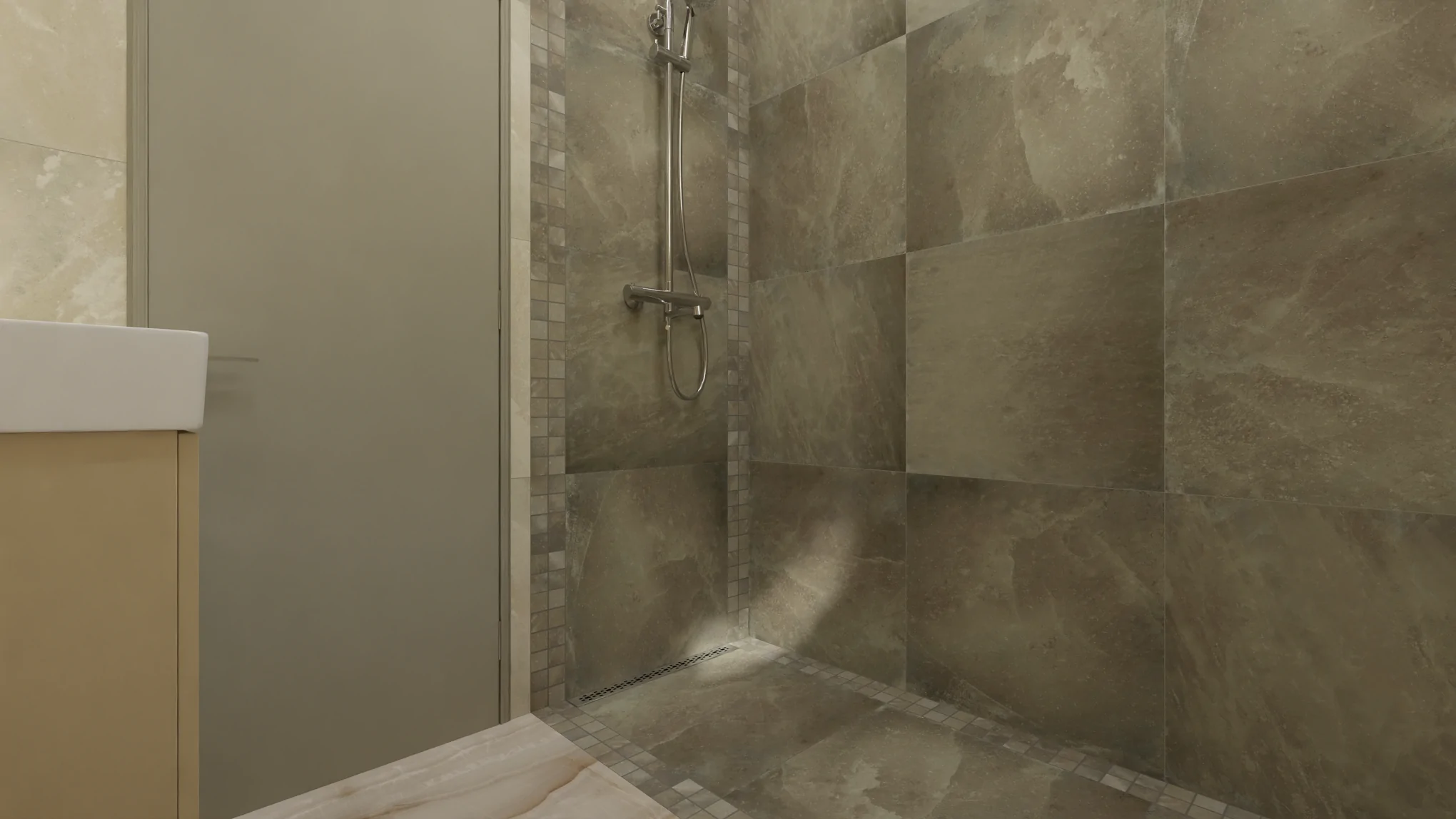 Выполнено чёткое зонирование: душевая зона и зона унитаза-умывальника. Пространство душевой шириной 80 см состоит из целой плиты керамогранита форматом 60х60 см и ровно по 2 чипа мозаики из такого же керамогранита. Пространство получается цельным и законченным без подрезки плит, а использование мозаики становится экономичным.