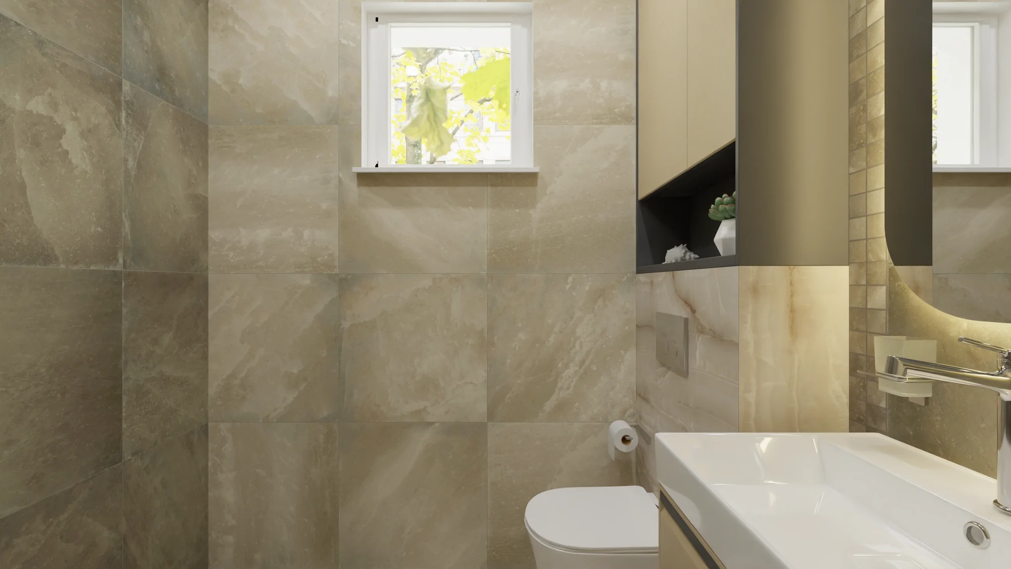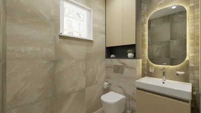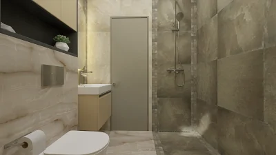 Стояла задача сделать уютным гостевой санузел 3.2 м2, подобрав компаньонов к керамограниту Empero Wave Beige CARVING (60х120). Сет дополнил керамогранит Coliseum Ривьера Дарк 60x60, мозаика Ривьера Дарк 30x30 и керамогранит Ривьера Уайт 60x60.
