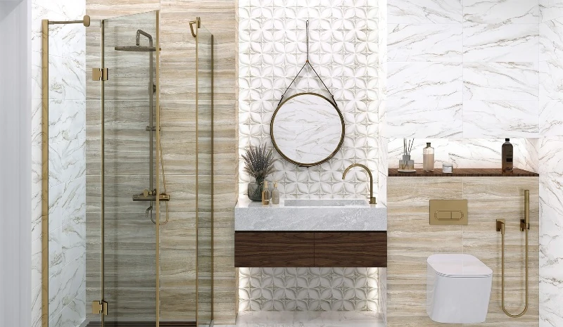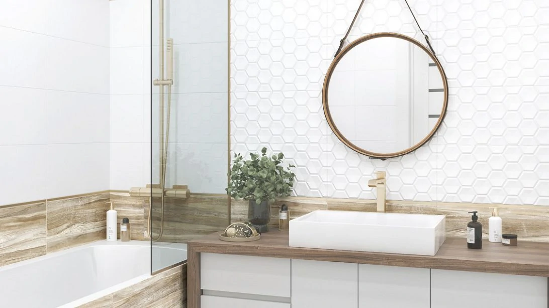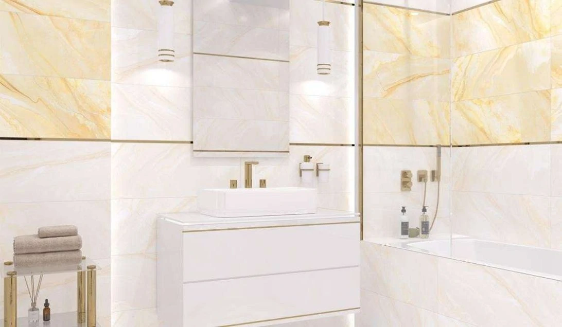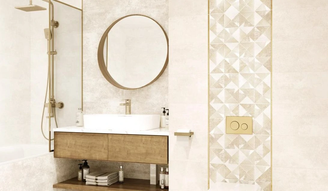 - Для стен — легкая плитка, с декором, бордюрами, 3D-эффектами.